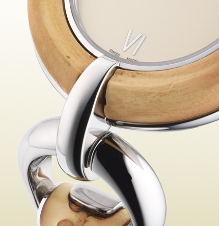 Stainless steel with natural bamboo bangle with adjustable links and horsebit buckle.