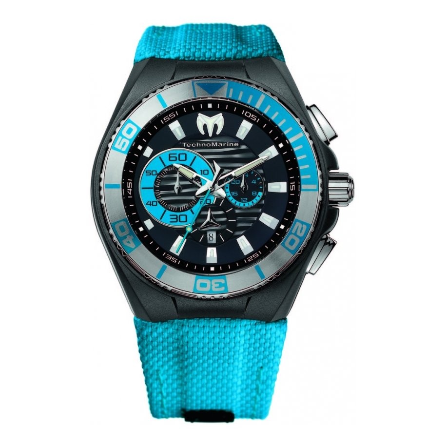 Stainless steel, silver and blue aluminum. Unidirectional rotating bezel.